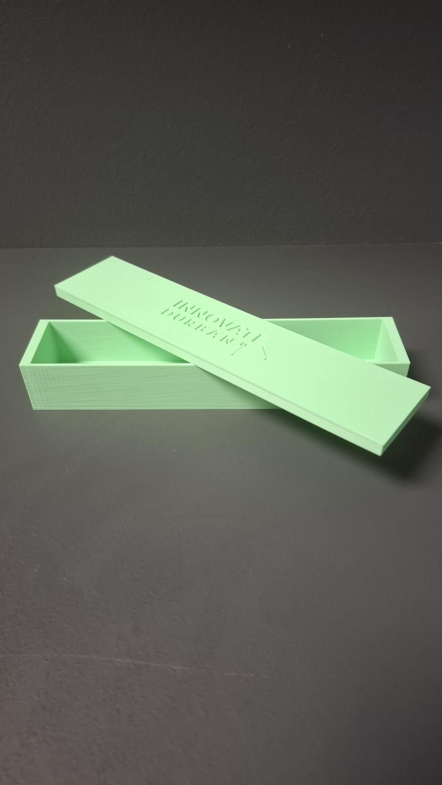 This custom made Innovate Durban 3D-Printed Jewellery Box for jewellery and small accessories was designed with a sleek, minimalist form and embossed branding for a premium touch. This compact rectangular box features a smooth mint-green finish, making it perfect for display on dressing tables, office desks, nightstands, or gift sets. The clean lines and modern lid design create a stylish, contemporary storage solution suitable for both personal and corporate use. Lightweight yet durable, the box is crafted using precision 3D-printing technology and high-quality PLA material, therefore ensuring a smooth surface texture and long-lasting performance.